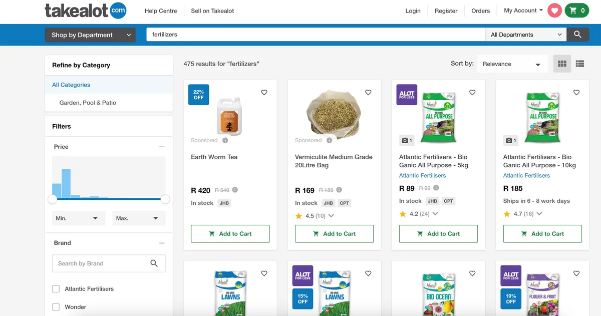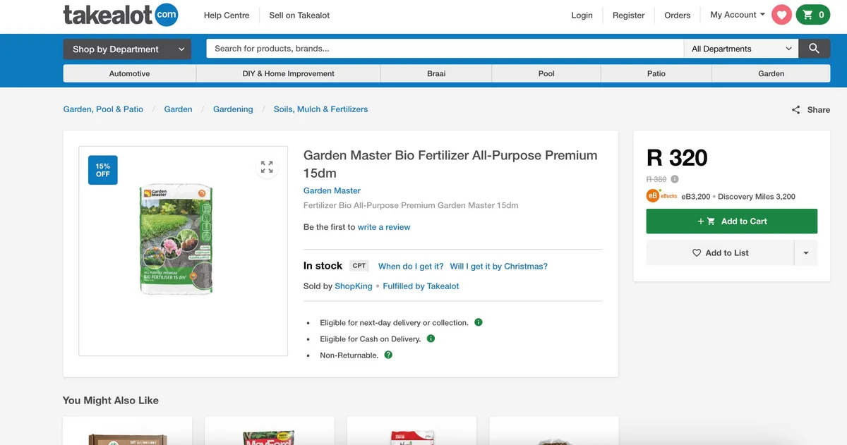 Although Takealot is a full eCommerce website with multiple (read almost every) category you would like to buy from, their garden section is not that intuitive. Although they stock fertilisers, there is no way to navigate to that section from the main menu - it is in fact better to search for “fertilisers” directly.