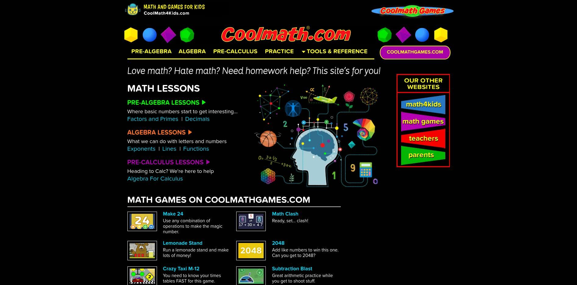 - CoolMath - Want your kid to be the next Elon Musk? Or even just enjoy math a little bit more, this site has been described as an “amusement park of math”. Children can play online math games that help them with addition, subtraction, multiplication, division, decimals, money and more. CoolMath is geared toward ages 13 and up, but sister site CoolMath4Kids.com is appropriate for ages 3 through 12.