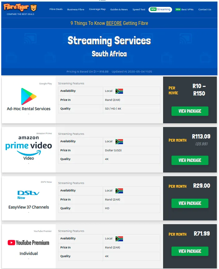Most of the local streaming services are also priced and billed in rands (ZAR) every month, except Amazon Prime Video.Although it's officially available locally, their listing price is dollar denominated, we have built in ZAR-USD conversion that updates hourly to showcase all pricing info in rands (ZAR).